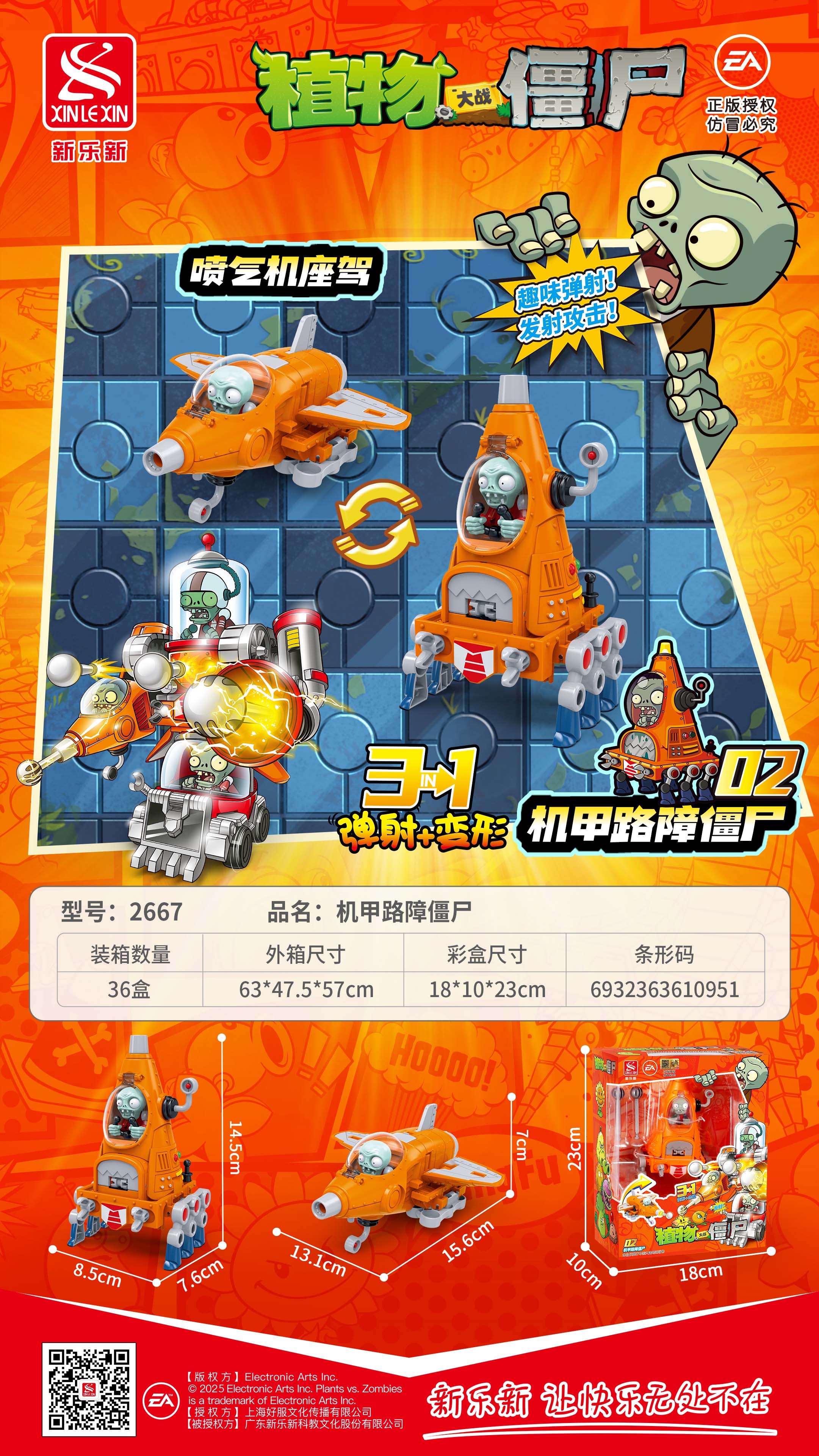- 產(chǎn)品規(guī)格:機甲路障僵尸:8.5*7.6*14.5,噴氣機座駕:13.1*15.6*7