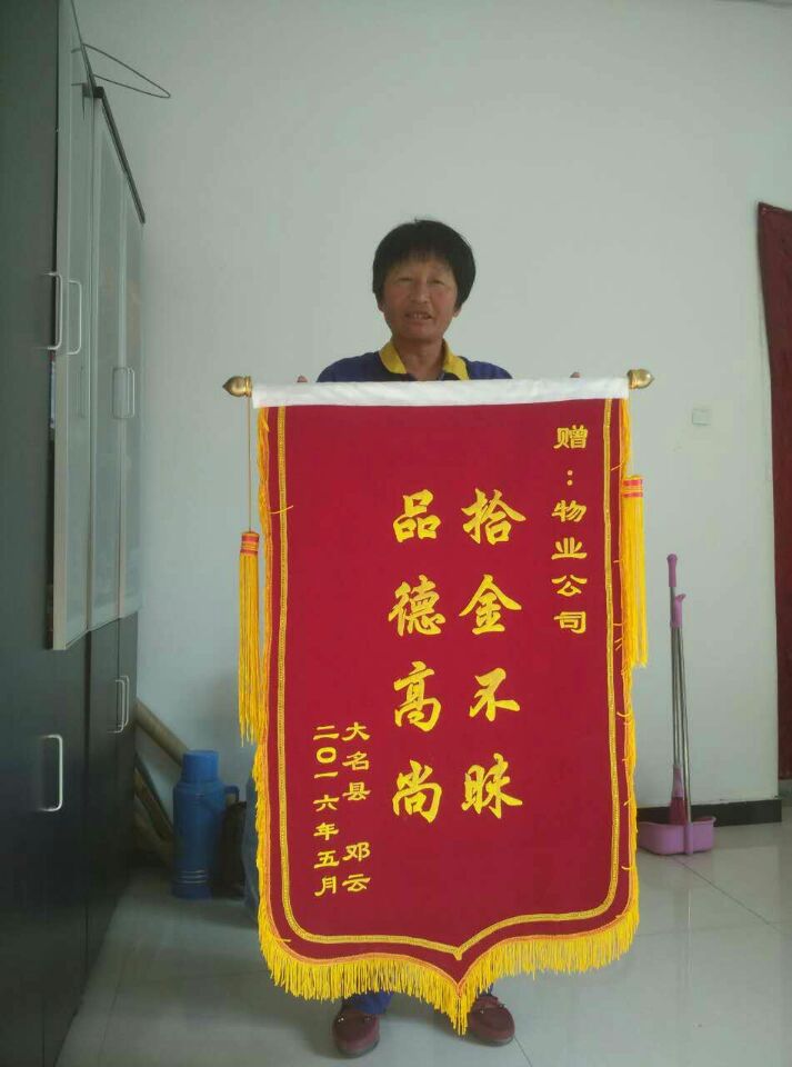 5月11日,邯鄲高科園區(qū)企業(yè)員工鄧云來到物業(yè)處,將一面寫有“拾金不昧 品德高尚”字樣的錦旗送到保潔工人郭愛手中,表達(dá)感激之情。